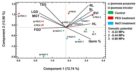 The mean values of the germination and seedling data were used in a Principal Component Analysis (PCA). The variables considered were clustered by the PCA and reduced to two main components with an eigenvalue greater than one, which together accounted for 86.65% of the total variability. The loading plots of the vectors and the scores of the two species in relation to these components are shown in Figure 9. Most of the overall variability of the analysed data was explained by the first component (72.74%). The variables with a positive correlation with the highest weight value in this component were the germination percentage, hypocotyl length (HL), and seedling vigour index (SVI). The variables related to the speed of germination, namely the first germination day (FGD), the last germination day (LGD), and the mean time of germination (MG), were negatively correlated. The first component separated the scores from the control treatments on its positive side and those of lower osmotic potential on the negative side. The second component, explaining an additional 13.90% of the total variability, was positively correlated with radicle length (RL) and the total spread of germination (TSG) and negatively correlated with the final percentage of germination (Germ %). The scores of I. purpurea at −0.88 MPa osmotic potential were separated along the OY axis, with the PEG score on the positive and the NaCl score on the negative extreme.
