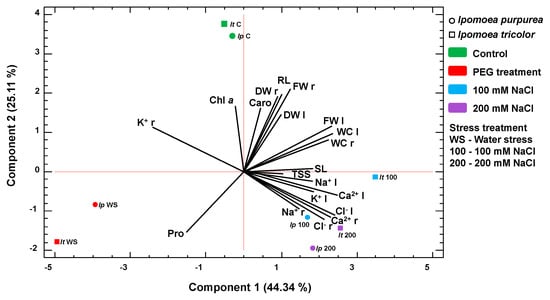 Figure 10. Principal Component Analysis of growth and biochemical data of Ipomoea purpurea and I. tricolor. Loading and scatter plots of the PCA scores were conducted only with the parameters that showed a significant correlation. Abbreviations: C, control; 100, 100 mM NaCl; 200, 200 mM NaCl; WS, water stress; FW r, root fresh weight; FW l, leaf fresh weight; DW r, root dry weight; DW l, leaf dry weight; WC r, root water content; WC l, leaf water content; Chl a chlorophyll a; Caro, carotenoids; Pro, proline; TSS, total soluble sugars; Na r, root sodium content; Na l, leaf sodium content; K r, root potassium content; K l, leaf potassium content; Cl r, root chlorine content; Cl l, leaf chlorine content; Ca r, root calcium content; Ca l, leaf calcium content.