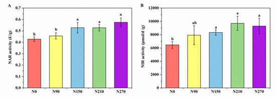 The soil NAR activity (A) and NIR activity (B) under different N fertilizer application rates. Bars indicate SD, different letters indicate significant differences among samples (p < 0.05, ANOVA). NAR, nitrate reductase; NIR, nitrite reductase. N0, N90, N150, N210, and N270 represent N fertilizer being used at a level of 0, 90, 150, 210, and 270 kg ha−1, respectively.