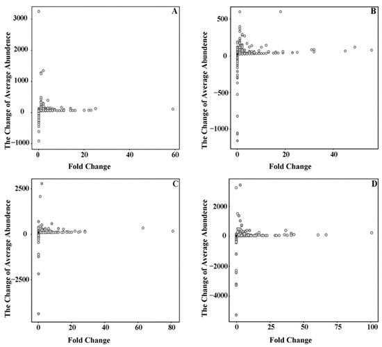 Significant enrichment (gray dots) and depletion (white dots) of all the detected OTUs included in four N fertilizer addition treatments ((A), N90; (B), N150; (C), N210; (D), N270) compared with N0. The x-axis is the difference in the average abundance between the two groups, the y-axis is the multiple difference in the average abundance between the two groups. Gray p < 0.05, white p > 0.05, and black p is NA.
