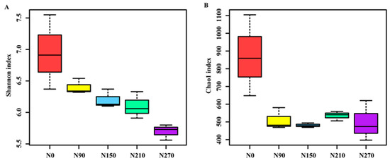 Shannon index (A) and Chao1 index (B) for nirS-type denitrifiers under different N fertilizer application rates. N0, N90, N150, N210, and N270 represent N fertilizer being used at a level of 0, 90, 150, 210, and 270 kg ha−1, respectively.