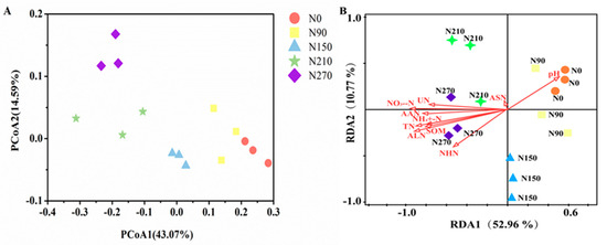 (A) Principal coordinates analysis (PCoA) plot of nirS-type denitrifier communities based on OTU. (B) Redundancy analysis (RDA) of nirS-type denitrifier community changes with soil nutrient variables under different N fertilizer application rates. SOM, soil organic matter; TN, total nitrogen; NH4+-N, ammonium nitrogen; NO3−-N, nitrate nitrogen; ALN, available nitrogen; AHN, acid-hydrolyzable organic nitrogen; AN, ammonia nitrogen; ASN, amino sugar nitrogen; UN, unidentified hydrolyzable nitrogen. N0, N90, N150, N210, and N270 represent N fertilizer being used at a level of 0, 90, 150, 210, and 270 kg ha−1, respectively.