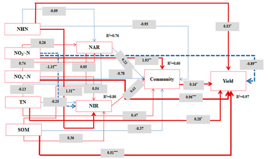 The structural equation model (SEM) between the soil nutrient content, denitrifying enzyme activity, nirS-type denitrifier community, and maize yield. The arrow width is proportional to the intensity of the path coefficient. Solid arrows represent positive path coefficients, dotted arrows represent negative path coefficients, and gray arrows represent path coefficients of 0. *, **, and *** represent p < 0.05, p < 0.01, and p < 0.001, respectively. AHN, acid-hydrolyzable organic nitrogen; NO3−-N, nitrate nitrogen; AN, ammonia nitrogen; TN, total nitrogen; SOM, soil organic matter.