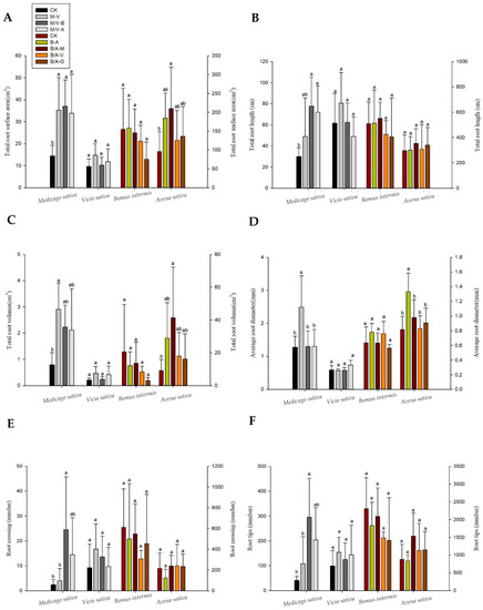 CK: monocropping of each herbage; M. Medicago sativa; V. Vicia sativa; B. Bromus inermis; A, Avena sativa; O, Onobrychis viciaefolia Scop. (M/V-B is M-B or V-B, same below.) (A) Significant differences in the root surface area of each pasture under different intercropping patterns. (B) Root total length. (C) Total root volume. (D) Average root diameter. (E) Root crossing. (F) Root tips. Differences in the geometric parameters of plant roots under different intercropping patterns. Different lowercase letters (a, b) indicate that the root system of the grass species was significantly different among planting patterns (p < 0.05).