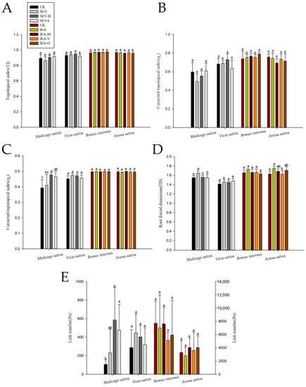 CK: monocrop for each herbage; M, Medicago sativa; V, Vicia sativa; B, Bromus inermis; A, Avena sativa; O, Onobrychis viciaefolia Scop. (M/V-B is M-B or V-B, same below.) (A) Significant differences in the topological index of each pasture under different intercropping patterns. (B) Corrected topological index (qa). (C) Corrected topological index (qb). (D) Root fractal dimension. (E) Link number. Different lowercase letters (a, b, and c) indicate that the root system of the grass species was significantly different among planting patterns (p < 0.05).