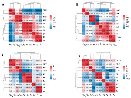 Correlation analysis of the root parameters. Alfalfa (A), common vetch (B), smooth brome (C), and oat (D). TRL: total root length; TRSA: total root surface area; TRV: total root volume; ARD: average root diameter; RT: root tips; RC: root crossing; FD: fractal dimension; TI: topological index; qa, qb: corrected topological index; Pe: link number.