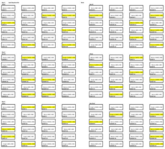 Each of the three replicates had 36 microplots; therefore, there were 108 microplots in each field site. Microplots were 3 × 3 m2 and there were 1.5 m alleys between the microplots. Experimental units were plots representing combinations of all possible treatment combinations (Figure 1). There were three blocks for all plant types in each repetition, to account for field variability. Soil, tillage, and crop treatments were applied as strip plots. Crops were planted in a split-block design, with whole plots in randomized complete blocks. Entire plot treatments were blocked by either no-tillage or conventional tillage practices. Manure and BC were completely randomized. The microplot layout for the loamy sand field is shown in Figure 1 to demonstrate the experimental design.