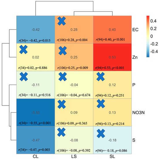 Pearson’s correlation r values for electrical conductivity correlations to other soil chemical properties compared by soil types; data with “×”s indicate a weak correlation.