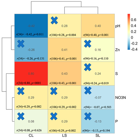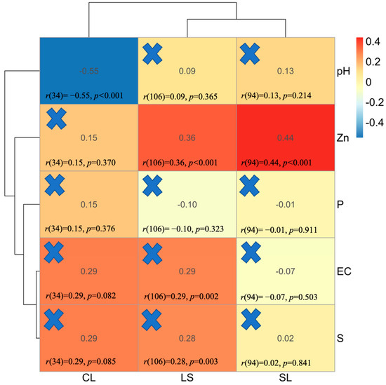 In Figure 5, a strong positive correlation between P and Zn (r (34) = 0.64, p < 0.001) was observed in the CL soil. This correlation is consistent with the historical trend of P and Zn correlation [22]. The presence of this correlation in the CL soil, but not in SL and LS soils, may be attributed to the increased clay content; clay loam has a greater ability to retain Zn and P. Clay can help to adsorp nutrients, such as zinc and phosphorus, to clay particles and retain them in the soil for longer durations.