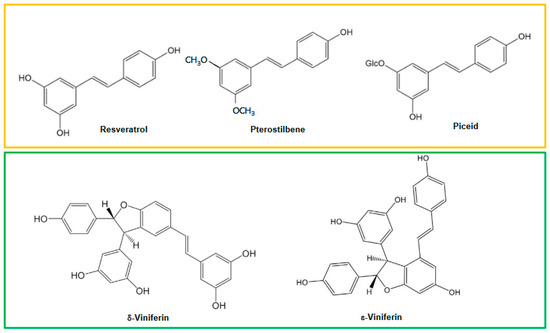 Structures of the five main stilbenes evoked in this study. Stilbene monomers, resveratrol; pterostilbene and piceid (3-O-resveratrol-β-D-glucoside). Resveratrol dimers, δ-viniferin and ε-viniferin, present in the Vitaceae. Glc = β-D-glucosyl moiety.