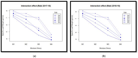 In different growth regulating compounds, PPFM at 1% (S4) resulted in increased specific leaf weight (6.70 and 6.82 g cm−2, during rabi 2017–18 and rabi 2018–19) in comparison to other forms of treatment. After that, 0.1 ppm brassinolide was sprayed on the leaves (S3) at grain filling stage. However, a lower SLW was noticed in the control (S5) during all two growing seasons.