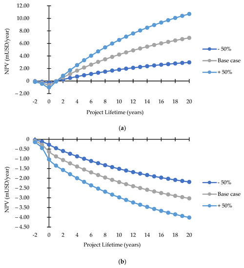 The economic assessment was carried out in Aspen Process Economic Analyzer v9.0 software. By analyzing the mass and energy balances, it was possible to design, size, and calculate the total capital cost. The methodology used was described by Peters et al. [48] and Rueda-Durán et al. [49]. In addition, the economic parameters (indicators, prices, rates, etc.) were considered based on the Colombian context and the study region and can be found in Supplementary Materials, in Table S1. Continuous-type processing is assumed for each scenario, with 2800 working hours per year, an interest rate of 9.34%, and an internal rate of return of 35%. The above was selected considering the regulations regarding work in rural areas of Colombia (8 h/day) [50]. The equipment depreciation method was a straight line and the economic viability of each scenario was evaluated considering the net present value (NPV) for ten years.