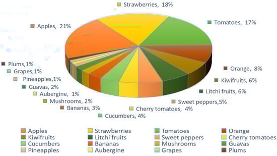 In agricultural production, harvest is one of the most important links. It directly relates to the quality of product harvest. However, traditional manual picking methods have problems such as high cost, low efficiency, and labor shortage, which seriously restrict the development of agricultural production. Therefore, it is urgent and necessary to study the technology of fruit and vegetable-picking robots, which is an important way to solve this problem. The visual recognition system, decision control system, and end-effector system are the key contents of the research on harvesting robot technology, and their technological maturity directly affects the harvesting effect of the robot. Intelligent harvesting system refers to a system that utilizes modern technology to achieve autonomous harvesting by the steps of recognition, decision, control, and grasping during the agricultural harvesting process. The intelligent picking system has the characteristics of efficiency, precision, and reliability, which can greatly improve agricultural production efficiency, reduce the labor burden of fruit farmers, and improve the quality and safety of agricultural production [1,2,3,4,5,6,7,8]. The literature distribution of intelligent harvesting systems for different crops is shown in Figure 1.