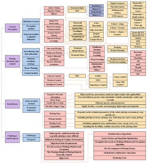 The picking decision and control of fruit and vegetable picking robots are key to ensuring the normal work and efficient picking of the robots. On the one hand, the design of the picking strategy needs to carry out a picking feasibility analysis according to the characteristics of the target fruits, maturity degree, growth environment, and other factors, and combine the hardware facilities of the picking platform, such as robotic arm, end-effector, sensor, to formulate a reasonable picking route and picking mode. On the other hand, picking control needs to realize the accurate positioning of the robot and accurate control of the motion of the manipulator, avoid damage to fruits and vegetables, ensure the picking efficiency and speed, and combine the actual scene and picking strategy for real-time adjustment and optimization. Therefore, reasonable picking strategy and accurate picking control are necessary conditions to ensure the efficient and stable operation of fruit and vegetable picking robots and are also one of the key technologies to realize agricultural production automation.
