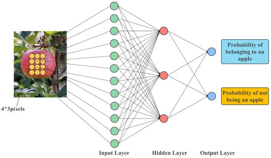 Deep learning is a new research direction in the field of machine learning, first proposed by Hinton et al. in 2006. The neural network in deep learning can be divided into three layers: the input layer; the hidden layer; and the output layer. After the input layer obtains the input image information, it passes the information to the hidden layer for feature extraction, and finally, the hidden layer outputs the model results. The working principle of the neural network presented in fully connected form is shown in Figure 3. Compared with the traditional shallow learning structures such as support vector machine (SVM) and artificial neural network (ANN), deep learning can extract the hidden features in the image and automatically learn to obtain the hierarchical feature representation (as shown in Figure 4a), which is more conducive to the classification or feature visualization. As the amount of training data increases, the advantages of deep learning models become more and more obvious (as shown in Figure 4b). In addition, deep learning has the flexibility to choose the number of network layers according to the designer’s needs. Based on the above advantages, in recent years, deep learning has been widely used in the target detection of fruits, vegetables, and other crops with good results.