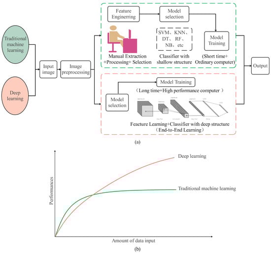 Comparison of Process and Performance between Traditional Machine Learning and Deep Learning in Image Processing: (a) Comparison of Image Processing Processes between Traditional Machine Learning and Deep Learning; (b) The relationship between the performance of traditional machine learning and deep learning and the amount of data input.