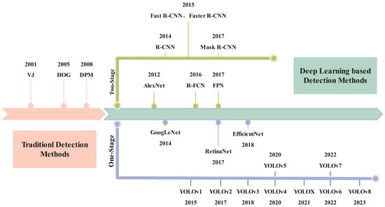 Unlike traditional manual feature-based detection algorithms (VJ, HOG, DPM), there are many detection algorithms in deep learning, which can be roughly divided into one-stage detection algorithms and two-stage detection algorithms according to the detection stage (as shown in Figure 5). Among them, two-stage detection algorithms mainly include RCNN, Faster R-CNN, Mask R-CNN, and so on. This type of algorithm performs target detection by first generating a pre-selected box that may contain the object to be detected (Proposal box) and then completing the identification and localization of the target after further detection based on the characteristics of the object. This kind of algorithm was quickly developed in the early stages of the application of deep learning technology because it has high detection precision and accuracy, but it also has the drawback of slower detection speed and is time-consuming. Unlike two-stage detection algorithms, single-stage detection algorithms, such as YOLO and SSD, do not require a region candidate network (PRN) and can directly extract features in the network to predict object classification and location, which is characterized by a one-step process and faster detection speed. The Yolo series of algorithms can reach 200 fps, much higher than the 5 fps of the two-stage algorithm Mask R-CNN, which is especially suitable for mobile platforms, but its detection accuracy is a bit poorer than that of algorithms such as Faster-RCNN. Table 4 compares and analyzes various network models used by different researchers.