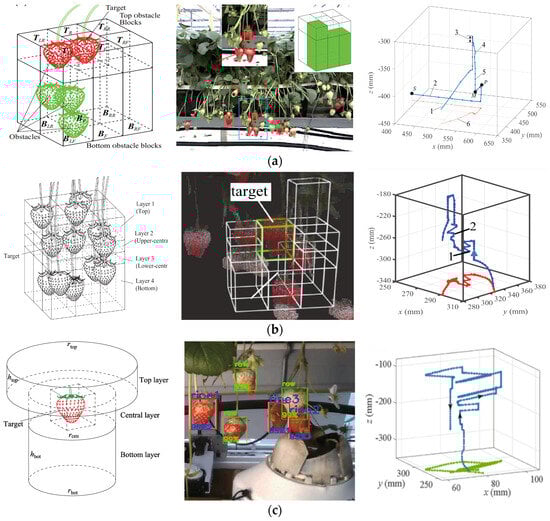 Regional independence: The region-independent strategy means that each robotic arm is individually responsible for a completely independent picking region, that there is no cross overlap between the sub-regions, and each robotic arm is only responsible for picking the target fruits in each sub-region, and this kind of task allocation can avoid the collision interference between multiple arms, and the requirements for the control system are also relatively low. Xiong et al. [67] used a low-cost dual Cartesian robotic arm in their preliminary study of strawberry picking, in which the two robotic arms had completely independent working partitions during picking, and each sub-area was divided into left and right half-areas, and the two arms started picking from the left half-area or the right half-area at the same time according to the density of the target strawberries, which ensured that there was a sufficient safety distance between the arms and avoided possible collisions. In the next study, Xiong et al. [91] put a new type of U-shaped arch-picking robot into the application; two three-degree-of-freedom robotic arms with non-contact fixtures were installed on both sides of the arch, which were responsible for picking strawberries in the left and right regions, respectively, which was a more complete independent region division, completely solving the problem of collision between multiple arms and at the same time, could effectively reduce the complexity of the control system.