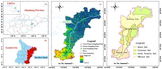The Jiao River, one of the three major water systems in Gaomi City, is known as the “the mother river” for Gaomi people. It runs from north to south, passing through Baicheng Town, Chaoyang Street, and Xiazhuang Town; and it is the main source of irrigation for agriculture in the JRB []. The study area is located in the east of Shandong Peninsula, ranging from 36°10′ N to 36°32′ N and 119°41′ E to 120°1′ E (Figure 1a,b). It is a traditional agricultural planting area of the JRB, characterized by a monsoon warm-temperate continental semi-humid climate, in which summer is humid and rainy, while winter is dry and less snowy. The terrain of the study area is high in the south and low in the north (Figure 1c). There were four primary soil types in the study area, namely brown soil, cinnamon soil, moisture soil, and sandy turmeric soil, which are all suitable for farming (Figure 1d). According to the current situation of agricultural development in Gaomi City, potato cultivation is mainly concentrated in Baicheng Town, leek cultivation is mainly concentrated in Xiazhuang Town, and corn and wheat are rotated throughout the entire JRB [,] (Figure 1c). The local government has always advocated the concept of ecological low-carbon green and environmentally friendly development in agricultural. Therefore, “Jiaohe Potato” was recognized as a “pollution-free agricultural product of Shandong Province” by the Shandong Provincial Department of Agriculture and Rural Affairs in 2005 and was evaluated as a “national geographical indication protection product” by the General Administration of Quality Supervision, Inspection, and Quarantine of the People’s Republic of China in 2010 []. Moreover, “Gaomi Xiazhuang Dajingou Leek” was approved as a pollution-free agricultural product by the Agricultural Product Quality and Safety Center of the Ministry of Agriculture of China in 2011 [].