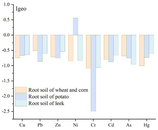 The calculated average values of according to Formula (1) are all nearly less than 0 (Figure 2), indicating that the soil in JRB was uncontaminated. The of Ni in the area where potatoes were grown ranges from 0 to 1, demonstrating that potato-growing region was uncontaminated to moderately contaminated with Ni. It was also noted that the of Cr in the soil of the area where potatoes were grown is the lowest, illustrating that cultivation of potatoes lead no geo-accumulation of Cr to the soil.
