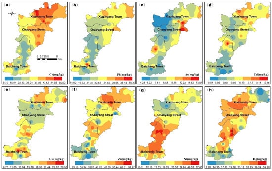 Based on the geochemical data of HMs, the inverse distance weighting method was applied to obtain the distribution patterns of HMs in JRB (Figure 3). As shown in Figure 3, the heterogeneous distribution of HMs in the JRB is consistent with the analysis results of CV values mentioned above (Table 5), which is possibly due to differences in local characteristic planting industries (Figure 1c) and soil types (Figure 1d). Cr and Pb show an overall distribution trend of low in Baicheng town with brown soil and high in Xiazhuang town with sandy turmeric siol (Figure 3a,b), hinting that Cr and Pb may be homologous and the planting of leeks may cause their geo-accumulation. The distribution of Cu, Zn, and Cd are relatively close, displaying a trend of low in the middle (with cinnamon soil and moisture soil) and high on both sides (Figure 3d–f), which can be explained by Cu, Zn, and Cd having the same source; furthermore, compared to traditional agricultural production, vegetable cultivation has more significant impact on their geo-accumulation. Ni is mainly concentrated in Baicheng Town (Figure 3g), suggesting that potato cultivation may cause Ni geo-accumulation. The distribution of As is relatively uniform, dominated by low values (Figure 3c), which may be due to the lock of sources. Hg is relatively non-homogeneously distributed throughout the region with high values (Figure 3h), indicating that different agricultural activities have different impacts on Hg aggregation.