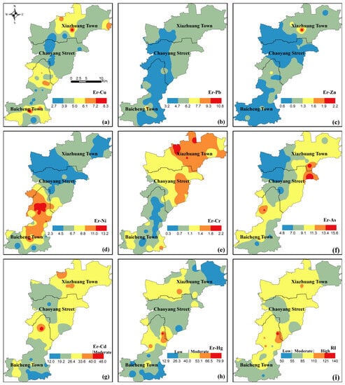 The and RI for different HMs were calculated based on Equations (3) and (4), respectively. The spatial distribution of the Er and RI are presented in Figure 5. Combining Figure 5 with Table 4, it was found that ERs of Cu, Pb, Zn, Ni, Cr, and As are low ( < 40) (Figure 5a–f). A large portion of Hg and Cd in JRB were in a low ER, with moderate ER distributed sporadically in a dotted pattern (Figure 5g,h). The RI was obtained by summing the Er values of eight HMs (Figure 5i) varying from 50 to 140. The RI for JRB is mainly moderate (), with both low () and high () ER areas distributed in a dotted pattern. This illustrates that although the value of individual HM is low, the RI value may be high.