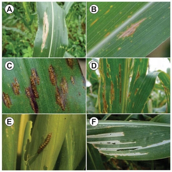 Images of corn leaf pest and disease samples: (A) maize leaf blight, (B) Helminthosporium maydis, (C) maize rust, (D) gray leaf spot, (E) stem borer, (F) corn armyworm.