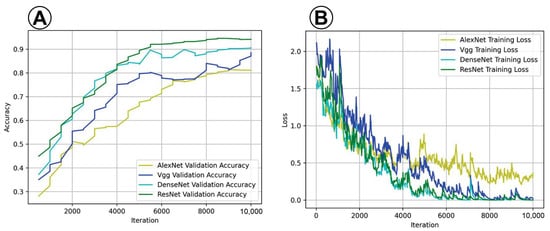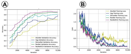 Deep learning model simulation comparison experiment: (A) validation accuracy curve, (B) training loss curve.