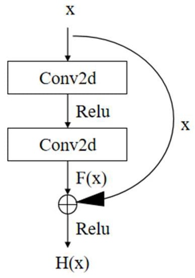 Convolutional neural networks originated from cortical vision research and have excellent performance in image recognition, target detection, and other fields [34]. However, as the layers of neural networks deepen, the models face the problems of gradient dispersion or explosion with network degradation. The network structure is relatively shallow, and the loss of the training set gradually decreases to a saturation value as the number of layers continues to increase. The loss does not keep leveling off, but gradually increases [35]. The use of residual blocks allows the depth of the network to be further deepened under the premise of ensuring normal operation [36]. The residual operation is formulated as shown by Xu, et al. [36].
