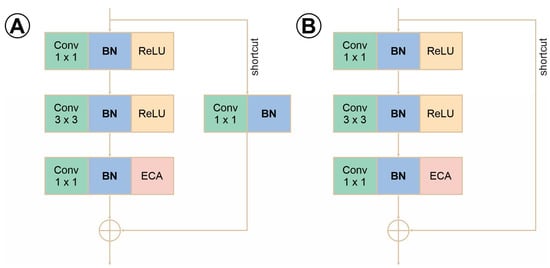 In this paper, ECA-Net is embedded into the residual network module, and ⨁ denotes the element product. The attention module is inserted into two blocks with a residual bottleneck structure which constitute block A and block B of the ECA-ResNet basic unit, respectively. When the number of input and output channels of a block is different, a convolutional layer is added to the proximity connection to change the feature map dimension, and the structure is like that of block A. When the number of input and output channels of a block is the same, the proximity connections can be added directly, and the structure is like that of block B. The input features are downscaled to reduce the number of feature channels, which reduces the computational effort and improves the model training speed. By improving the residual network module, we strengthen the connection between the feature channels within the residuals and enhance the model’s ability to extract key features at a deeper level.