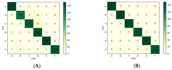 Confusion matrix: (A) ResNet50, (B) ECA-Adam-ResNet50. Note: A is maize leaf blight; B is stem borer; C is corn armyworm; D is gray leaf spot; E is Helminthosporium maydis; F is rust.