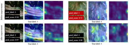 Figure 10 shows some examples of disease prediction results and class activation feature map visualization results before and after the model improvement. The shallow convolution of the improved model has an improved ability to extract detailed texture information of leaves, which can better achieve the recognition of fine disease spots. The improved model can more accurately determine the occurrence area of disease spots on leaves; for example, in the results of Figure 6, more attention is paid to the leaf edge features for corn gray spot disease, and more attention is paid to the inner leaf spot area for small spot disease.