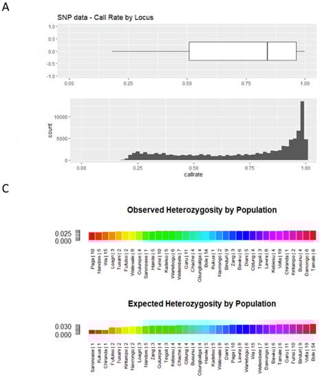 The filtered SNP markers were of high quality, in terms of call rates (0.94 to 1.0), and highly reproducible (1.0). The genetic diversity of the population was low (Hs = 0.0406), with a fixation index of 0.0022 and heterozygosity of 0.034, all indicating a possibility of inbreeding. Generally, the observed heterozygosity was lower than the expected heterozygosity (Figure 5C) except for in locations with a low sample size (one to four samples per location) (Supplementary Figure S1). Inbreeding is likely the reason for such behavior in a population [23].