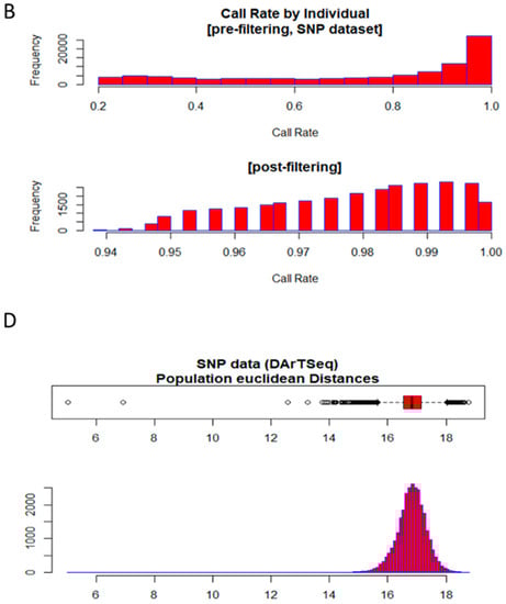 A total of 12,103 loci involving 263 genotypes were covered after the sequencing, which generated 94,985 SNPs with 26.76% missing data. Generally, the call rate per locus ranged from 0.18 to 1.0. (Figure 3A); however, the average was 0.73. A series of filtering steps were performed to improve the quality of the final SNPs for analysis. The first was filtering by SNP call rate, with 95% as the threshold; this resulted in call rates between 0.94 and 1.0 (Figure 3B). All monomorphic loci were removed, and the results were filtered for trimmed sequence tags using a hamming distance of less than 0.25; this resulted in 12,101 binary SNPs for the remaining 239 diploid genotypes.