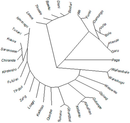 A phylogenetic tree constructed based on the Euclidean distance calculation using neighbor-joining clustering had 34 tips and 32 internal nodes. Three branches were obtained. The first branch consisted of five locations with two sub-branches. The first sub-branch had only one location, Lawra, and the other sub-branch had four locations, Tamale, Bawku, Diani and Binduri. The next branch, which is in the middle, consisted of eight locations with two main sub-branches. The first sub-branch consisted of seven locations separated into three sub-units. The second sub-branch consisted of only Paga. The third main branch consisted of twenty-one locations separated into two main sub-branches with many other peripheral branches. Walewale and Wellembele, Gulumpe, Nandom and Kebiesu, Kukua, Saronoase, Chiranda and Kintampo were all sub-branches within the third main branch (Figure 4).