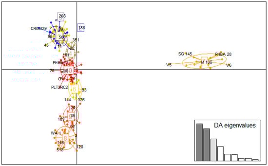 Discriminant analysis of principal components (DAPC) was based on a kinship matrix (K = 3), which was obtained from the Bayesian Information Criterion (BIC) value (Supplementary Figure S3). Two discriminant axis (DA) values were retained for the analysis. Three main clusters were observed (Figure 6 and Supplementary Figure S4) in individuals from different locations showing close genetic relationships. The two largest clusters occurred around the axis of separations whereas the third was further from them. The first major cluster comprised CRIG339, CRIG98, CRIG43, CRIG500, CRIG11, CRIG89, CRIG189 and CRIG35, the second cluster also consisted of CRIG144, B3, CRIG326, CRIG206, CRIG188, PHBA60, CRIG161 and CRIG39, and the third cluster included SG145, V5, M186, V6 and PHBA28.