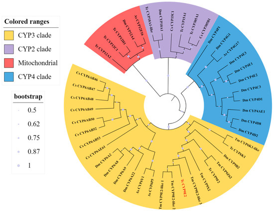 30. Zhu, F.; Moural, T.W.; Shah, K.; Palli, S.R. Integrated analysis of cytochrome P450 gene superfamily in the red flour beetle, Tribolium castaneum. BMC Genom. 2013, 14, 174. [Google Scholar] [CrossRef]