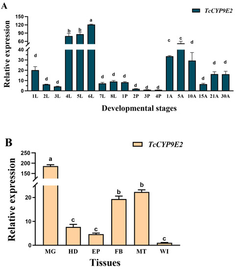 Figure 2. Relative expression levels of TcCYP9E2 in different developmental stages (A) and tissues (B) of T. castaneum. 1L-8L: larvae 1–8 instars; 1P-4P: 1 to 4 days for pupae; 1A: on the first day of the adult; 5A: adult at 5th day; 10A: adult at 10th day; 15A: adult at 15th day; 21A: adult at 21st day; 30A: adult at 30th day; MG: midgut: HD: head: EP: epidermis: FB: fat body; MT: Malpighian tubule system; WI: wing. Three biological replicates were conducted for each development stage, and 35 test insects were collected for each replicate. Each replicate involved the dissection of 100 adult insects. (Mean ± SE; Tukey’s test; different letters in the figure indicate significant differences between groups, p < 0.05).