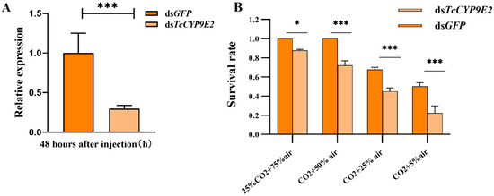 Figure 3. TcCYP9E2 interference efficiency (A) and detection of changes in its sensitivity to CO2. (B) Values are presented as the means ± SE. ***: p < 0.001, *: p < 0.05 (independent samples t-test). Three biological replicates were performed on 60 T. castaneum larvae in each treatment.