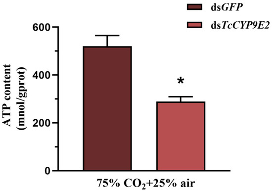 Figure 5. Effect of TcCYP9E2 RNAi on ATP content in T. castaneum in 75% CO2 conditions. Values are presented as the means ± SE. *: p < 0.05 (independent-samples t-test). Three biological replicates were performed on 60 larvae of T. castaneum in each treatment.