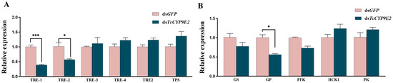 Figure 6. Effect of TcCYP9E2 RNAi on the expression of genes related to the trehalose metabolic pathway (A) and energy metabolism (B) in T. castaneum in 75% CO2 conditions. TRE: trehalase; TPS: trehalose-6-phosphate synthase; GS: glycogen synthase; GP: glycogen phosphorylase; PFK: phosphofructokinase; HCK1: hexokinase; PK: pyruvate kinase. Three biological replicates were performed on 60 larvae of T. castaneum in each treatment. Values are presented as the means ± SE. ***: p < 0.001, *: p < 0.05 (independent-samples t-test).