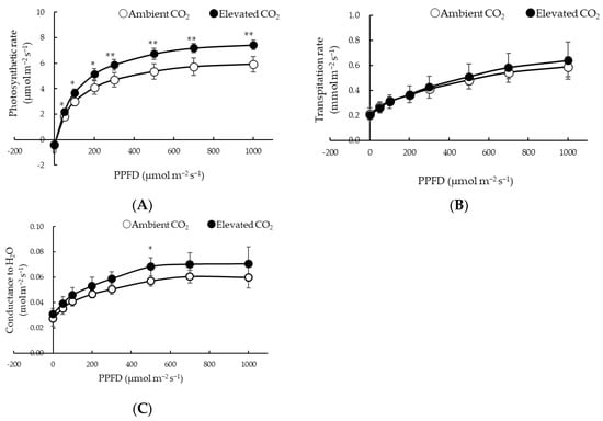 - Baligar, V.C.; Bunce, J.A.; Machado, R.C.R.; Elson, M.K. Photosynthetic photon flux density, carbon dioxide concentration, and vapor pressure deficit effects on photosynthesis in cacao seedlings. Photosynthetica 2008, 46, 216–221. [Google Scholar] [CrossRef]