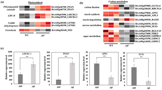Heat map visualization of DEGs in photosynthesis and carbon metabolism pathways. The light and dark red lattices represented the up-regulation of gene expression levels, while the light and dark gray lattices represented the down-regulation of gene expression levels. (a) Heat map visualization of DEGs in the photosynthesis pathway. The transcriptional levels of PSAN, LHCB2.3, and LFNR1 were all up–regulated in ygl. However, the FD3 expression level was suppressed in ygl. (b) Heat map visualization of DEGs in carbon fixation, starch metabolism, sucrose metabolism, and sugar metabolism pathways. All the DEGs in carbon fixation, starch synthesis, sucrose metabolism, and sugar metabolism showed a significant down–regulation. However, BAM5 in starch degradation was up–regulated in ygl. (c) The expression levels of four DEGs by RT-qPCR analysis. Compared to A03, LHCB2.3 and PSAN were remarkably up–regulated in ygl. However, APS1 and SUS1 were markedly down-regulated. Asterisks (**) indicate significant differences (p < 0.01).