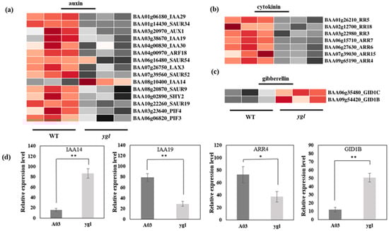Heat map visualization of DEGs in the phytohormone pathway. The light and dark red lattices represented the up-regulation of gene expression levels, while the light and dark gray lattices represented the down-regulation of gene expression levels. (a) Heat map visualization of DEGs in the auxin pathway. All the DEGs in the auxin pathway were down-regulated, except IAA14 in ygl. (b) Heat map visualization of DEGs in the cytokinin pathway. All the DEGs in the cytokinin pathway displayed identical down–regulated trends. (c) Heat map visualization of DEGs in the gibberellin pathway. Both GID1B and GID1C transcriptional levels increased markedly in ygl. (d) The expression levels of four DEGs by qRT–PCR analysis. Compared to A03, IAA14 and GID1B were conspicuously up–regulated in ygl. However, the mRNA levels of IAA19 and ARR4 were noticeably down–regulated in ygl. Asterisks (* or **) indicate significant differences (p < 0.05 or p < 0.01, respectively).