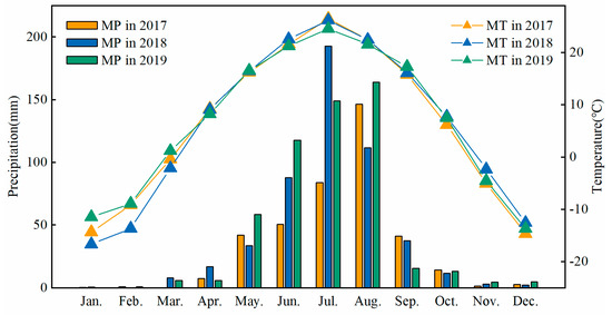 Variations in monthly precipitation and temperature in 2017, 2018 and 2019 years within the study area. MP: Monthly precipitation; MT: Monthly temperature.