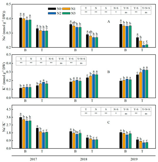 The effects of straw nitrogen fertilizer on the ratio of Na+ (A), K+ (B), and Na+/K+ (C) in rice leaves in saline-sodic fields from 2017 to 2019. The mean values of three repetitions ± SE (n = 3) were used, and different letters were used to indicate statistical significance at the p < 0.05 level. ns: non-significant, *: significant at p < 0.05, **: significant at p < 0.01. B: no straw returning to field; T: 7 t ha−1 of straw returning to field. N0, N1, N2 and N3 were 0, 150, 250 and 350 kg ha−1 of nitrogen fertilizer, respectively. Y: year, N: nitrogen fertilizer, S: straw.