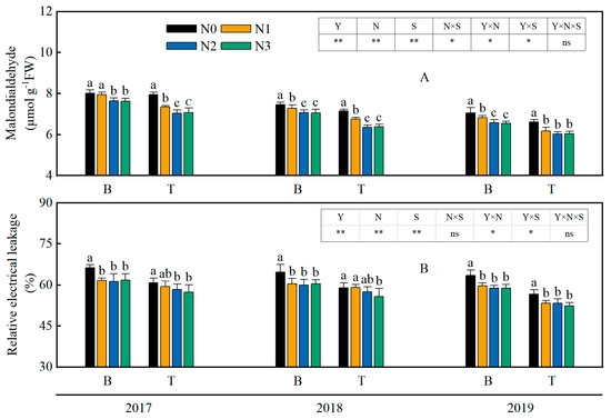 The effects of straw nitrogen fertilizer on the ratio of malondialdehyde (MDA) (A) and relative electricity leakage (REL) (B) in rice leaves in saline-sodic fields from 2017 to 2019. The mean values of three repetitions ± SE (n = 3) were used, and different letters were used to indicate statistical significance at the p < 0.05 level. ns: non-significant, *: significant at p < 0.05, **: significant at p < 0.01. B: no straw returning to field; T: 7 t ha−1 of straw returning to field. N0, N1, N2, and N3 were 0, 150, 250, and 350 kg ha−1 of nitrogen fertilizer, respectively. Y: year, N: nitrogen fertilizer, S: straw.