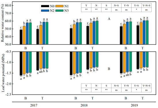 The effects of straw nitrogen fertilizer on relative water content (RWC) (A) and leaf water potential (Ψw) (B) in rice leaves in saline-sodic fields from 2017 to 2019. The mean values of three repetitions ± SE (n = 3) were used, and different letters were used to indicate statistical significance at the p < 0.05 level. ns: non-significant, *: significant at p < 0.05, **: significant at p < 0.01. B: no straw returning to field; T: 7 t ha−1 of straw returning to field. N0, N1, N2, and N3 were 0, 150, 250, and 350 kg ha−1 of nitrogen fertilizer, respectively. Y: year, N: nitrogen fertilizer, S: straw.