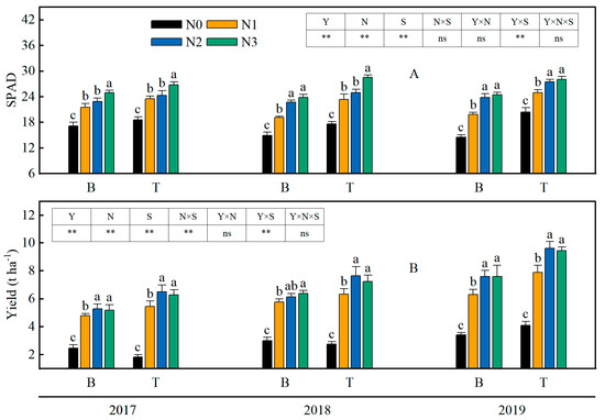 The effects of straw nitrogen fertilizer on SPAD in rice leaves (A) and yield (B) in saline-sodic fields from 2017 to 2019. The mean values of three repetitions ± SE (n = 3) were used, and different letters were used to indicate statistical significance at the p < 0.05 level. ns: non-significant, **: significant at p < 0.01. B: no straw returning to field; T: 7 t ha−1 of straw returning to field. N0, N1, N2, and N3 were 0, 150, 250, and 350 kg ha−1 of nitrogen fertilizer, respectively. Y: year, N: nitrogen fertilizer, S: straw.