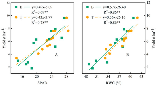 Relationship between rice yield and SPAD (A), yield and RWC (B) in 2017–2019. B: no straw returning to field; T: 7 t ha−1 of straw returning to field. ** is significantly correlated with p < 0.01. Yield: rice yield; RWC: Relative water content.